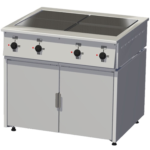 Данная электроплита оснащена 4-мя плоскими конфорками и вместительным нейтральным шкафом с дверцами. По производительности наилучшим образом подойдёт кафе, столовой, ресторану среднего формата. Конструкционный материал электрической плиты — нержавеющая + оцинкованная сталь.