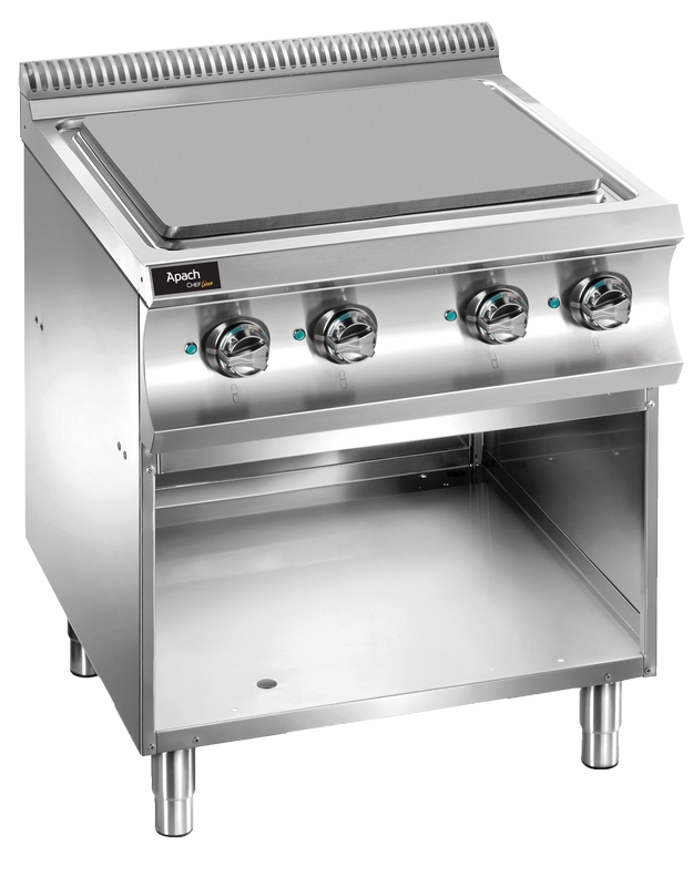 Плита со сплошной поверхностью Apach Chef Line GLFTE99OS — электрическая модель теплового оборудования. Сплошная поверхность отличается особым удобством в использовании посуды любых форм и размеров, а также своей экономичностью — во время нагрева одной зоны, тепло распределяется на всю конфорку, что сокращает время нагрева остальных зон.