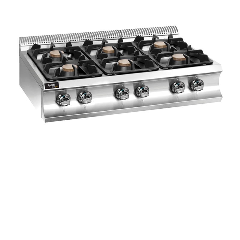Apach Chef Line GLRRG129 представляет собой профессиональную газовую плиту с 6 горелками. Модель прекрасно подходит для применения в сфере общественного питания и пищевого производства. Изделие отличается высокой прочностью, надежностью, рассчитано на длительный срок службы. На варочной поверхности расположено 6 газовых горелок общей мощностью 54 кВт. Их зарывает прочная раздельная решетка.