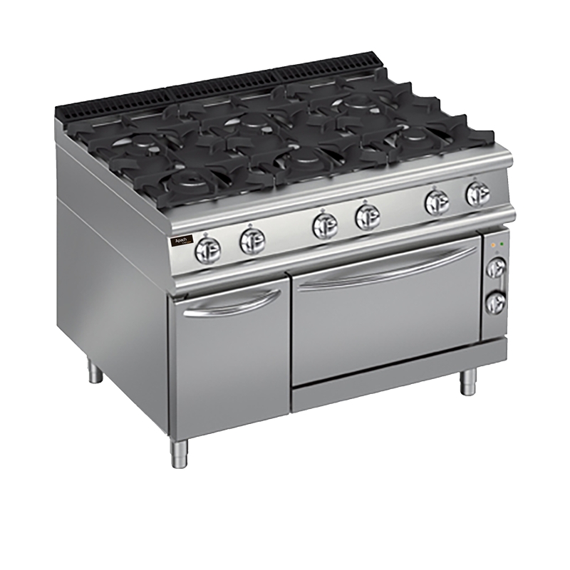 Apach Chef Line LRG129FECS – газовая плита с конфорками и духовым шкафом. Модель рассчитана на профессиональное применение. Она идеально подходит для установки в ресторанах, кафе, столовых, на пищевых производствах. Аппарат оборудован 6 газовыми горелками мощностью по 5,4 кВт каждая. Посуда устанавливается на прочную решетку секционного типа. Она способна выдержать высокие нагрузки. В нижней части конструкции расположен духовой шкаф и отсек для хранения инвентаря.