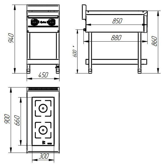 Плита встроена в прямоугольный корпус, установленный на четырех регулируемых по высоте ножках. Между ножками расположена низкая полкой. Ножки, полка, боковые и задние панели корпуса изготовлены из окрашенного металла. Сверху плита накрыта стальной рамой, в которую встроена рабочая поверхность из стеклокерамики с двумя индукционными конфорками. Передняя панель корпуса выполнена из нержавеющей стали. На ней расположены два регулятора мощности нагрева для каждой из конфорок. Сзади на корпусе установлен воздуховод и вентилятор с термодатчиком. Под корпусом расположен жироулавливающий фильтр. Для готовки на плите необходимо использовать стальную и алюминиевую посуду с ферромагнитным дном или чугун.