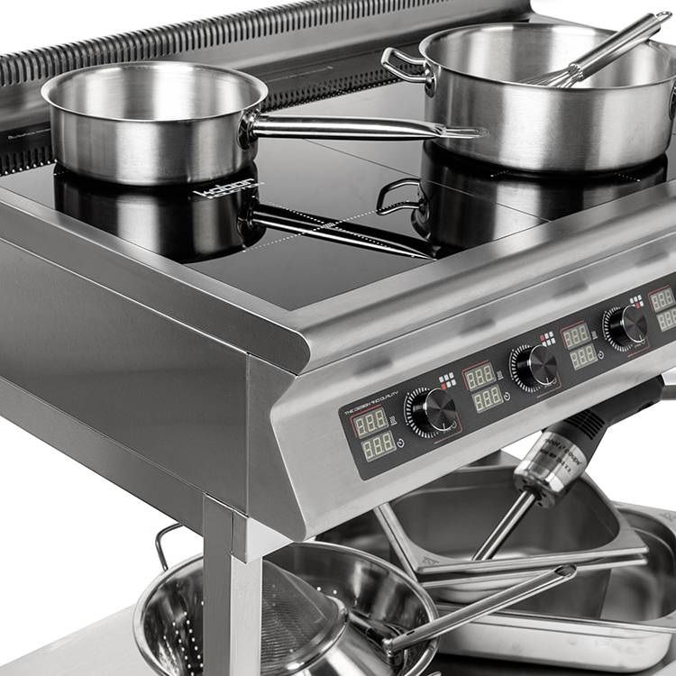 Плита индукционная КОБОР I7-6Sпредставляет собой индукционную плиту профессионального класса. Модель рассчитана на использование в составе 700-й линии. Оборудование подходит для оснащения пунктов общественного питания, торговых точек. На рабочей панели установлено две индукционные конфорки. Нагрев осуществляется мгновенно, при этом нагревается поверхность посуды, рабочая поверхность разогревается незначительно, что делает использование оборудования безопаснее. Корпус произведен из нержавеющей стали марки AISI304, варочная панель произведена из монолитной прочной стеклокерамики.