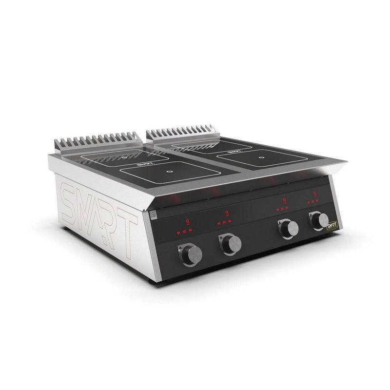 Smart Induction C74-5Bпредставляет собой индукционную плиту настольного типа. Модель рассчитана на оснащение торговых точек, пунктов общественного питания. В конструкции предусмотрена электромеханическая панель управления. Для очищения поступающего внутрь жира и влаги воздуха применяется жировой фильтр. На варочной панели установлено 4 конфорки размером 350х295 мм каждая. Мощность каждой конфорки составляет 5 кВт. Конфорка выдерживает нагрузку до 50 кг. Столешница, корпус и воздуховод произведены из нержавеющей стали марки AISI430. Для изготовления рабочей поверхности применяется стеклокерамика. На фасадную часть нанесено полимерное покрытие черного цвета.