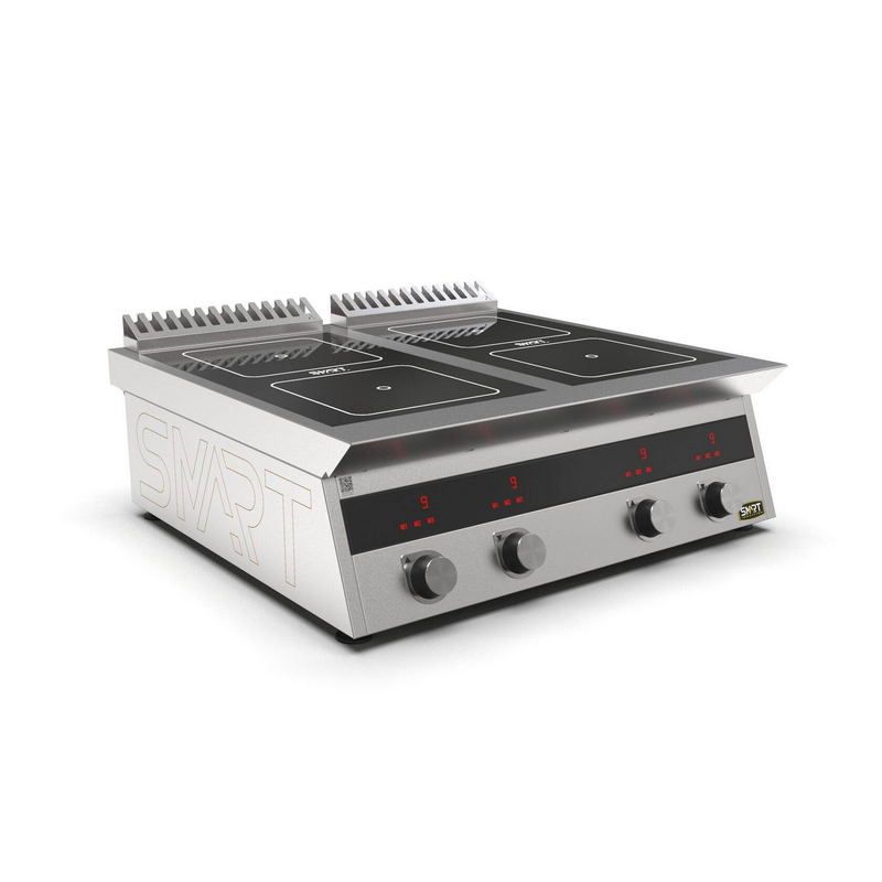 Smart Induction C74-3Nпредставляет собой индукционную плиту настольного типа. Модель предназначена для оснащения пунктов общественного питания, торговых точек. Модель оснащена 4 индукционными конфорками размером 350х295 мм и мощностью 3,5 кВт. Каждая из них способна выдержать нагрузку до 50 кг. Оборудование оснащено таймером длительностью до 99 минут. Корпус, столешница и воздуховод произведены из нержавеющей стали AISI430. Для изготовления рабочей поверхности применяется стеклокерамика. Фасадная часть выполнена из нержавеющей стали.