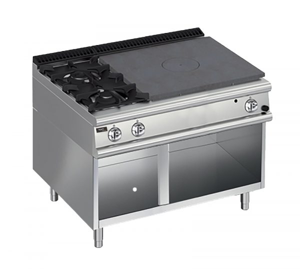 Apach Chef Line LRSTG127R2SXOS представляет собой профессиональную газовую плиту. Модель подходит для оборудования пунктов общественного питания, пищевых производств, торговых точек. На комбинированной варочной поверхности располагаются две классические газовые горелки и зона концентрического нагрева. Общая мощность равна 22,5 кВт. В нижней части располагается два открытых отсека для хранения, где можно сложить используемую посуду и инвентарь.