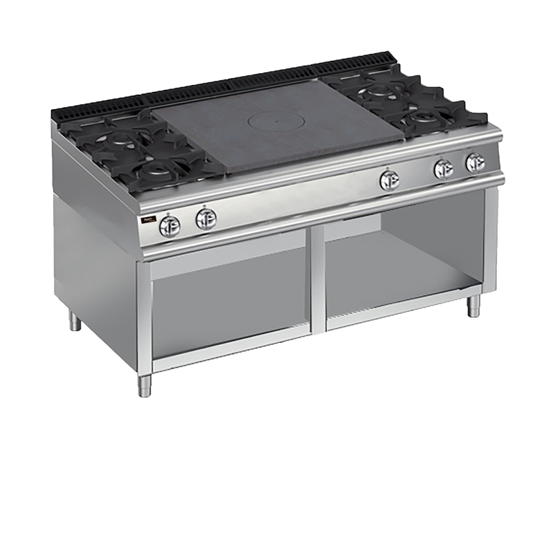 Apach Chef Line LRSTG127R4OS – профессиональная газовая плита с комбинированной варочной поверхностью. На ней расположен концентрический нагревательный элемент и четыре газовых горелки, по две с каждой из сторон. Управляется оборудование с помощью съемной панели с поворотными регуляторами эргономичной формы. В нижней части корпуса размещается вместительный открытый отсек для хранения.