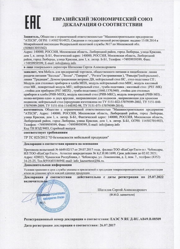 Атеси Регата П-1-1370-02 представляет собой одноярусную полку, предназначенную для выкладки готовых блюд и напитков для передачи их клиенту. Изделие предназначено для установки на столешницу модуля раздаточной линии серии «Регата». Конструкция выполнена из пищевой нержавеющей стали. В конструкции предусмотрен козырек из гнутого стекла.
