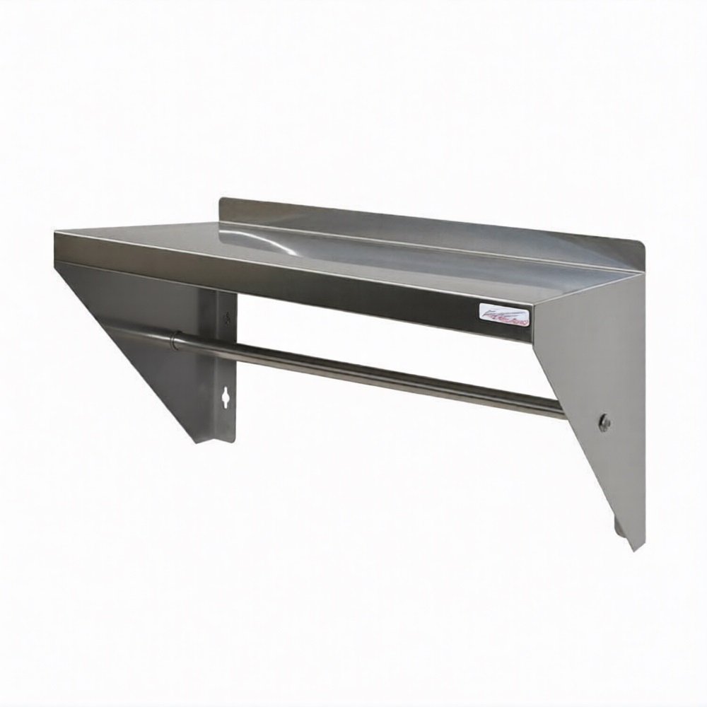 Полка Финист ПКри (800х300х300) полностью изготовлена из нержавеющей стали. Конструкция полки предусматривает крепление ее на стену. Для удобного хранения различного кухонного инвентаря на полке установлен рейлинг.