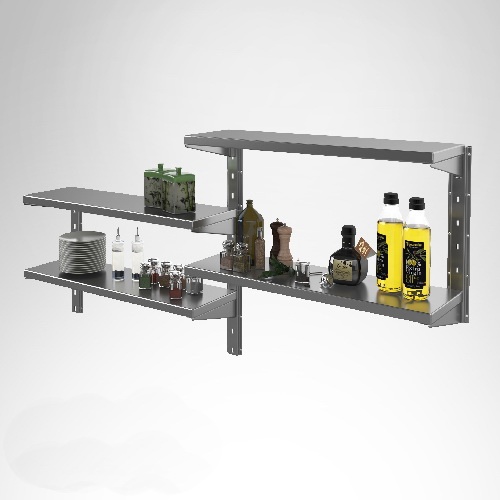 2-уровневая полка Финист настенная на кронштейнах, крепится к стене анкерными болтами или подобным способом. На планках имеются пазы для регулировки высоты установки полок.