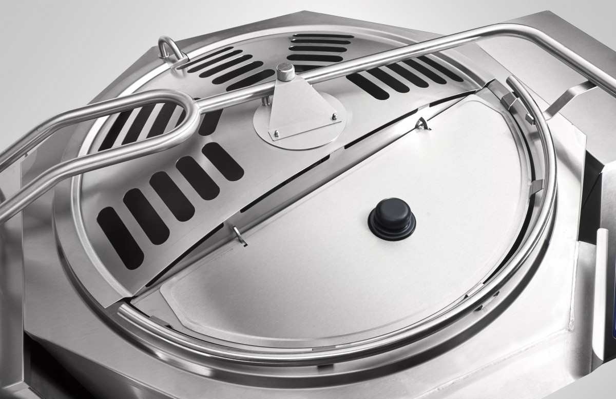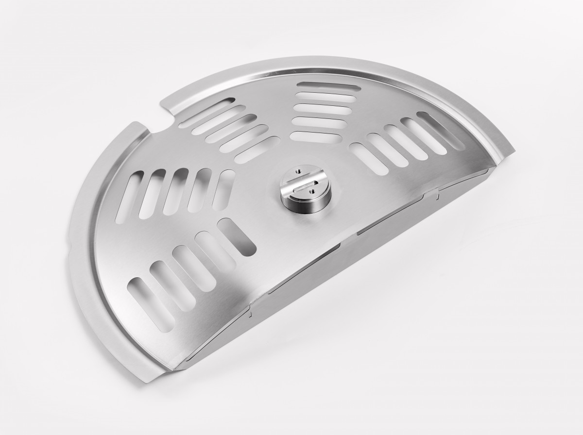 Полукрышка изготовлена из нержавеющей стали и обладает полукруглой формой. В центре находится крепление для ручки крышки котла, а по всей площади – множественные отверстия для выхода пара.