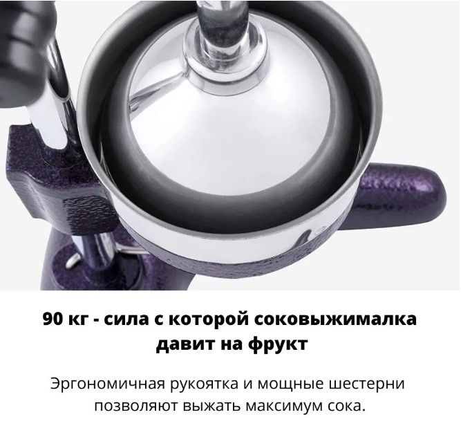 - Эргономичная рукоятка и мощные шестерни позволяют выжать максимум сока.