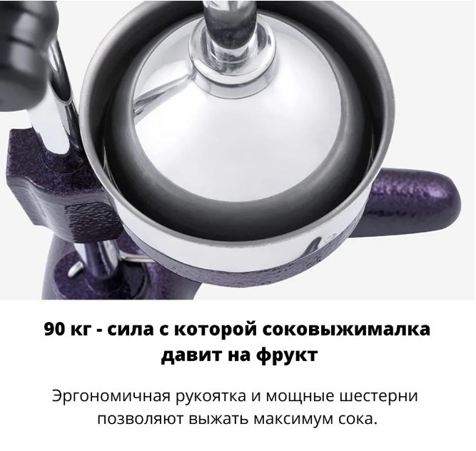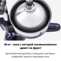 • Эргономичная рукоятка и мощные шестерни позволяют выжать максимум сока.