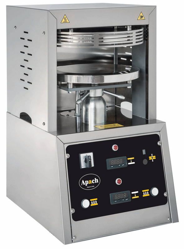 Пресс для пиццы ApachAPRESS45используется для автоматизированного приготовления лепешек для пиццы и других плоских изделий из теса. На кухне пиццерии такой аппарат заменит профессионального пиццайоло, а времени на приготовление заготовки уйдет гораздо меньше. Продолжительность выпекания зависит от вида теста и его толщины. Верхний уровень у пресса остается неподвижным, а высота верхнего изменяется механической рукояткой. Для работы пресс подключают к сети 380 В. Уровень энергопотребления составляет 5,6 кВт.
