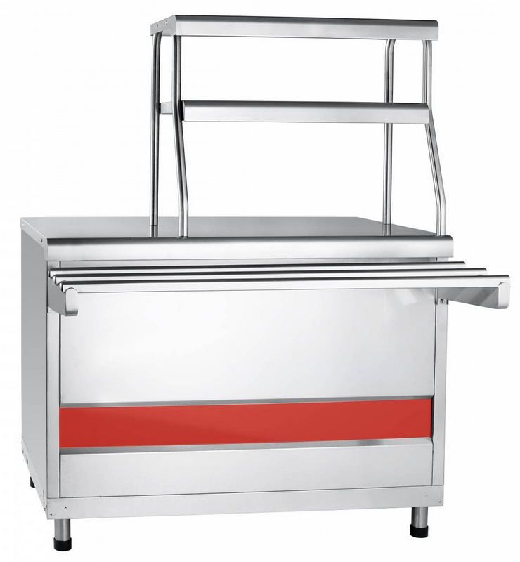 Прилавок состоит из корпуса прямоугольной формы и полок над ним. Обшивка корпуса выполнена из листовой нержавеющей стали. Остальные элементы тоже стальные. Передняя панель имеет красную полосу, характерную для серии. К ней прикреплены кронштейны с направляющими для подносов. Сзади находится панель с розетками для подключения электрооборудования. Там же расположены две распашные дверцы нейтрального шкафа для кухонного инвентаря. Корпус накрыт сплошной столешницей, на которой установлена двухъярусная полка для тарелок с изделиями и чашек (стаканов) с напитками. Часть столешницы свободна и используется для установки чайника или термостата с горячим напитком.