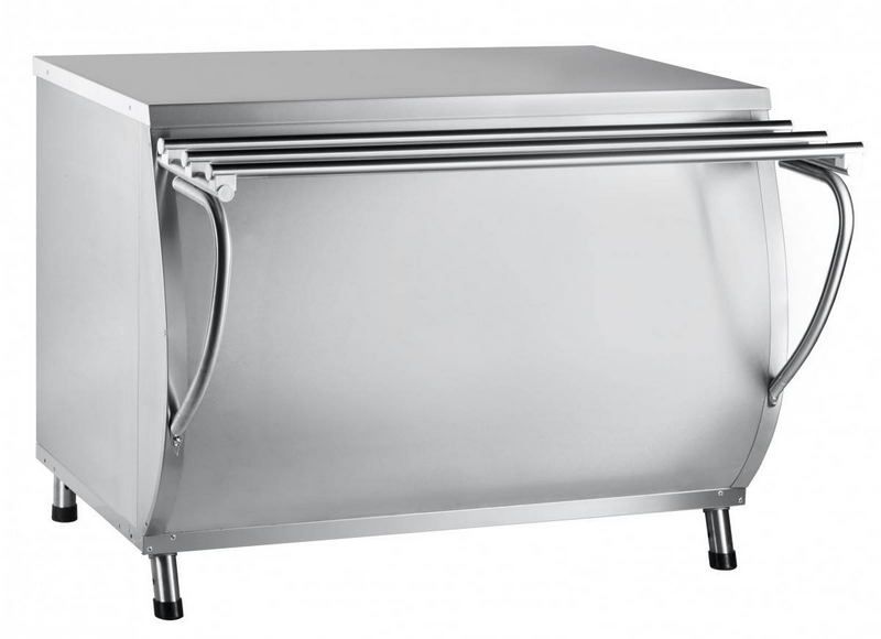 На столешнице прилавка можно установить кипятильник, подключив дополнительное оборудование к встроенной в прилавок розетке 220В. Внизу прилавка расположен нейтральный шкаф, в котором можно хранить различный кухонный инвентарь. В комплект поставки входят направляющие для подносов. Ножки регулируются по высоте.