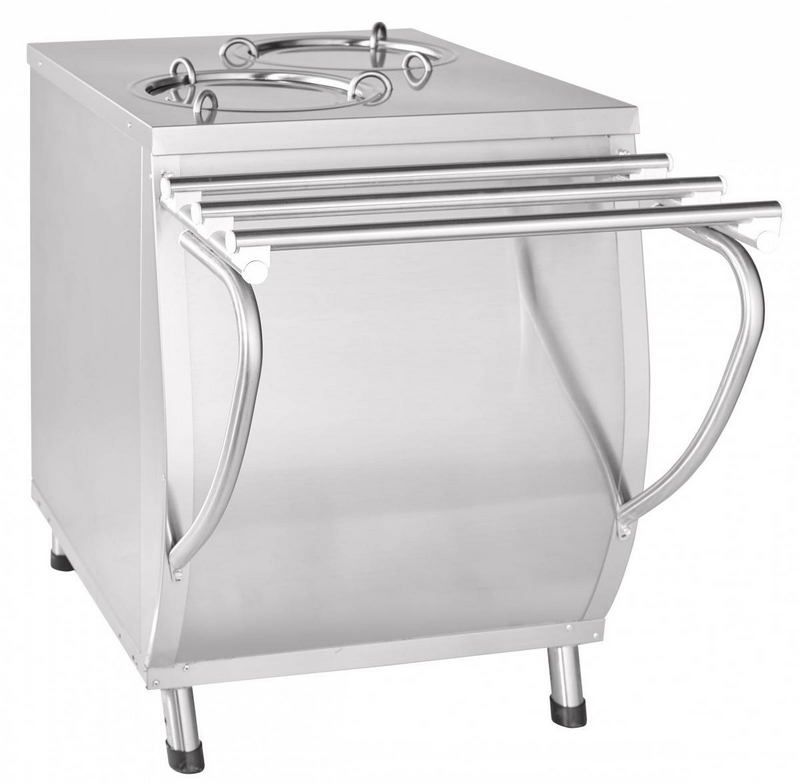 Модель оснащена пружинным механизмом кассетницы, которая производит автоматический подъем тарелок по мере их использования и регулируемыми по высоте ножками. Конструкция выполнена из нержавеющей стали.