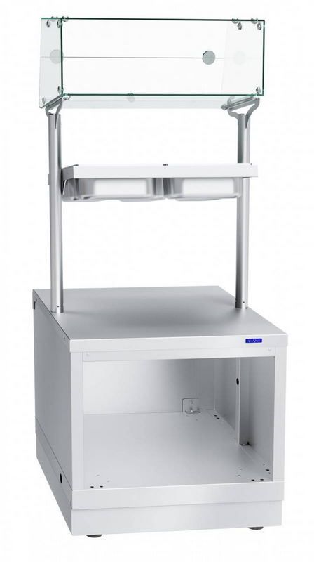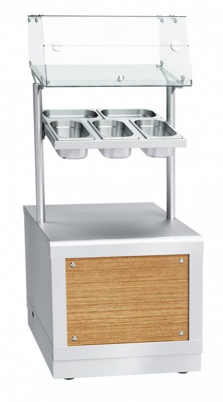 В конструкции предусмотрено 5 гастрономических емкостей, рассчитанных на хранение столовых приборов. В верхней части корпуса расположена хлебница. Опорные ножки прикрывает цокольная вставка, она защищает от скопления пыли.