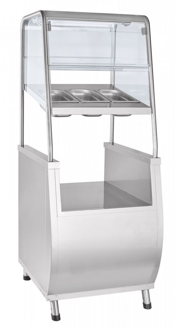 Изготовленный из удовлетворяющей санитарным требованиям нержавеющей стали, прилавок укомплектован 3 емкостями под столовые приборы и защитными экранами подсвечиваемых полок.