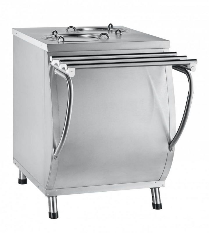 Модель оснащена пружинным механизмом кассетницы, которая производит автоматический подъем тарелок по мере их использования и регулируемыми по высоте ножками. Конструкция выполнена из нержавеющей стали.