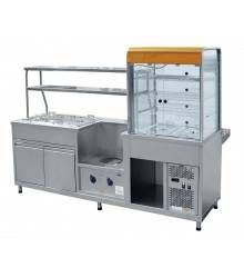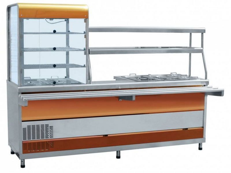 Справа расположена снабженная подсветкой охлаждающая витрина для напитков и закусок. Под ней в корпусе справа находится холодильный агрегат, слева образуется свободное пространство для инвентаря. Блюда располагаются на трех полках-решетках в верхней части витрины и во встроенных в столешницу гастроемкостях. Сзади витрина оборудована двумя распашными дверями для продавца, а спереди находятся четыре маленьких поднимающихся дверцы для покупателей.