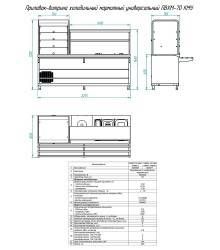 В центре прилавка на уровне середины высоты установлена полка с конфоркой для котла с первыми блюдами. Слева от нее (относительно продавца) расположен мармит для вторых блюд. Он состоит из паровой ванны со встроенным ПЭНами и нескольких функциональных емкостей над ней. При кипении воды в ванне образующийся пар нагревает лотки с пищей. Под ванной находится нейтральный шкаф с двумя распашными дверцами. Для выкладки готовых блюд в тарелках над устройствами предусмотрена двухъярусная полка. Мармит и конфорка управляются встроенными в центральную заднюю панель терморегуляторами.