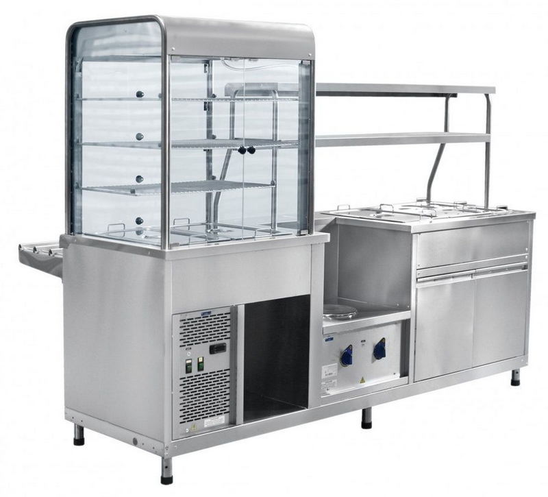 В центре прилавка на уровне середины высоты установлена полка с конфоркой для котла с первыми блюдами. Слева от нее (относительно продавца) расположен мармит для вторых блюд. Он состоит из паровой ванны со встроенным ПЭНами и нескольких функциональных емкостей над ней. При кипении воды в ванне образующийся пар нагревает лотки с пищей. Под ванной находится нейтральный шкаф с двумя распашными дверцами. Для выкладки готовых блюд в тарелках над устройствами предусмотрена двухъярусная полка. Мармит и конфорка управляются встроенными в центральную заднюю панель терморегуляторами.
