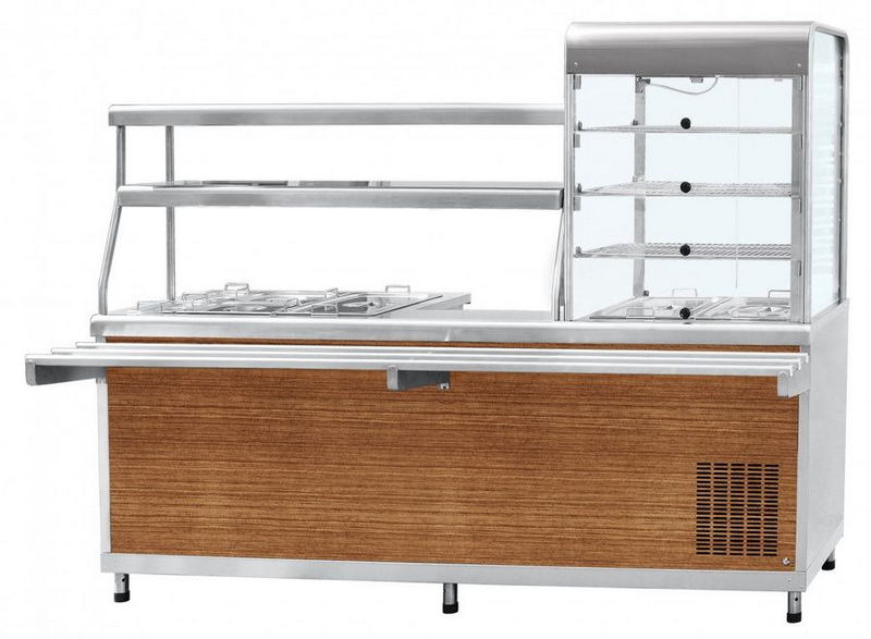 Справа расположена снабженная подсветкой охлаждающая витрина для напитков и закусок. Под ней в корпусе справа находится холодильный агрегат, слева образуется свободное пространство для инвентаря. Блюда располагаются на трех полках-решетках в верхней части витрины и во встроенных в столешницу гастроемкостях. Сзади витрина оборудована двумя распашными дверями для продавца, а спереди находятся четыре маленьких поднимающихся дверцы для покупателей.