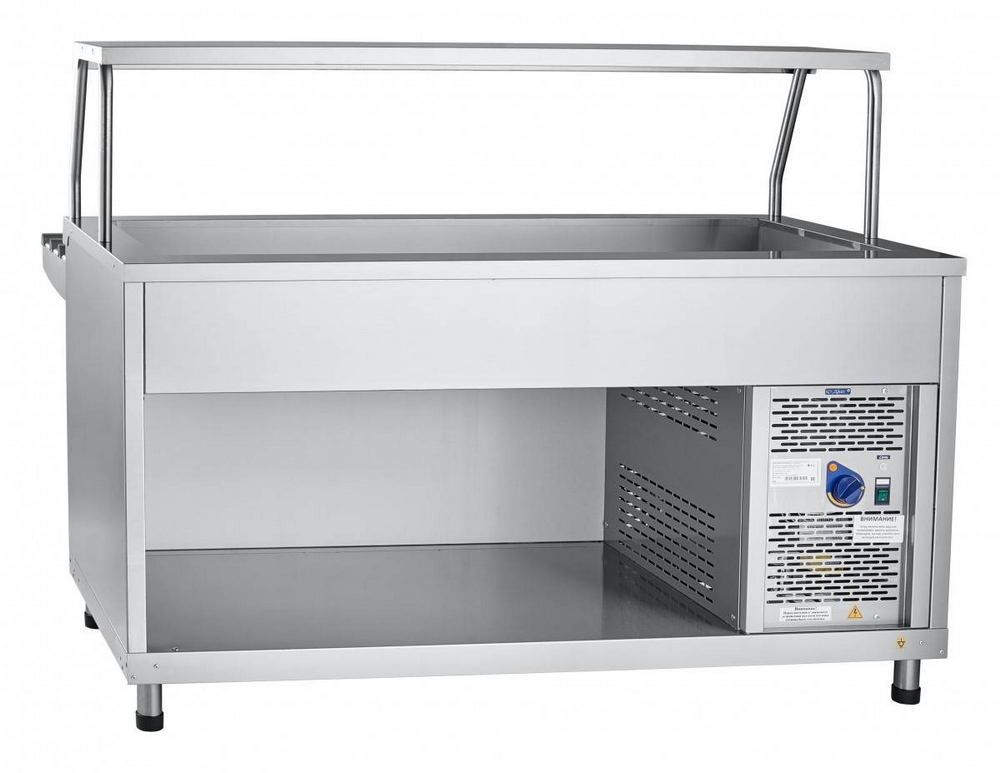 Прилавок состоит из прямоугольного корпуса и надставленной над ним полкой для неохлаждаемых блюд с подстветкой. Корпус представляет собой основание, на которое прикреплены обшивки боковых и передней стенок, а сверху установлена столешница в виде ванны. Со стороны покупателя на корпусе установлены кронштейны с направляющими для подносов. Под ванной в корпусе находится холодильный агрегат, а свободное место применяется как нейтральный шкаф. Спереди на обшивке агрегата расположена панель управления с терморегулятором. Горизонтальное положение и неподвижность всей конструкции придают регулируемые ножки.