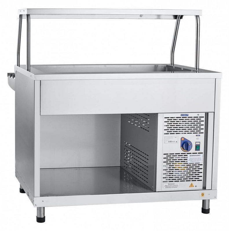 Прилавок представляет собой прямоугольный корпус с надставленной над ним полкой для неохлаждаемых блюд. Корпус состоит из основания, прикрепленных к нему обшивок боковых и передней стенок, установленной сверху столешницы в виде ванны. Последняя удобна для охлаждения напитков в банках и бутылках. В корпусе под ванной расположен агрегат в обшивке, оставшееся свободное место используется под хранение кухонного инвентаря. На передней стороне обшивки агрегата находится панель управления прилавком. Со стороны покупателя на корпусе установлены кронштейны с направляющими для подносов. Для неподвижности в конструкции предусмотрены регулируемые ножки.