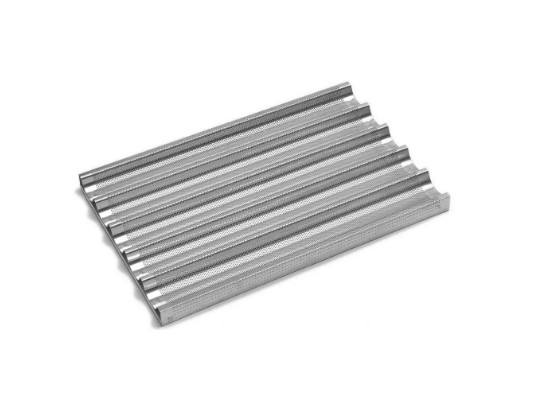 Противень представляет собой перфорированный алюминиевый лист, изогнутый волнообразно. В его 5 каналов для расстойки и выпечки помещаются продолговатые заготовки из теста.