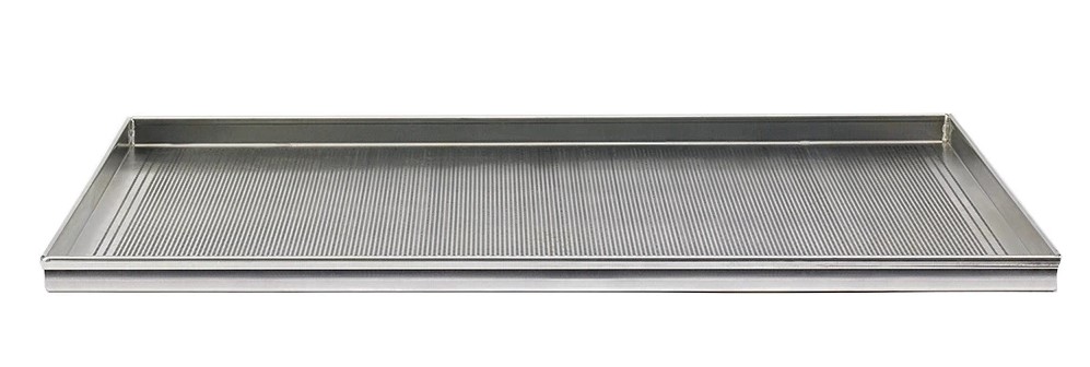 Габаритные размеры 600х400х20мм, борт с четырех сторон, сварен по углам, высота борта 20мм, борт имеет двойной подгиб, перфорация, материал – пищевой алюминий.