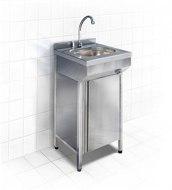 Подача воды осуществляется путем нажатия кнопки расположенной на скошенной панели рукомойника. Наличие закрытого объема позволяет экономить место для хранения средств очистки и гигиены.