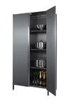 Шкаф выполнен на каркасе из нержавеющей трубы 25*25 мм, все остальное полностью из импортной нержавеющей стали. Каркасное исполнение шкафа позволяет повысить надежность конструкции. Двери распашные. В стандартном исполнении шкаф комплектуется тремя промежуточными полками. Благодаря каркасу из трубы 25*25 мм увеличен запас прочности шкафа.