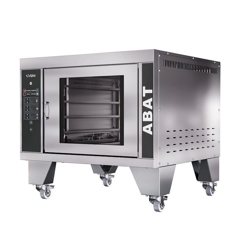 Abat РПШ-10-6-4Ппредставляет собой ротационную печь, относящуюся к серии Eхpert. Предназначена для выпечки хлебобулочных и кондитерских изделий на предприятиях общественного питания и торговли. Готовность продуктов достигается за счёт нагрева паром и горячим воздухом совместно или по отдельности. Инновационная система пароувлажнения каскадно-лоткового типа гарантирует эффективное насыщение воздуха в рабочей камере паром, что позволяет получить выпечку наивысшего качества. Совершенная аэродинамика и вращение поворотной стойки обеспечивают равномерную температуру по всему объёму камеры и позволяют достичь одинаковой окраски выпечки на всех уровнях. Расстоечный шкаф ШРТ-10-6-4П может использоваться как самостоятельное изделие, так и совместно с ротационным пекарским шкафом РПШ-10-6-4П серии CHEF. Оборудование может работать в следующих режимах: