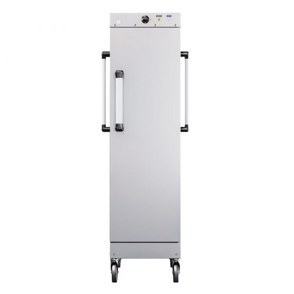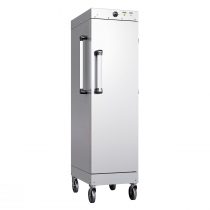 Прямоугольный корпус шкафа изготовлен из нержавеющей стали, снабжен 4 колесами со стопорными механизмами и 2 боковыми ручками-скобами для удобного маневрирования. Распашная дверь с правыми петлями также оборудована ручкой-скобой. Рабочая камера изнутри обшита нержавеющей сталью, внутри расположены 16 пар направляющих для размещения подносов с тарелками или гастроемкостей GN 1/1.