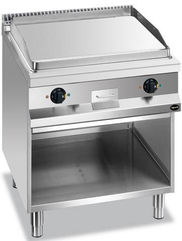 Рабочая поверхность стальная оснащена зоной сбора конденсата. С трёх сторон приподнятые бортики сковороды предотвращают разбрызгивание жира. Небольшой наклон сковороды вперед. Емкость для сбора излишков жира. Вытяжная решётка вдоль модуля. Зона хранения открытого типа. Регулировочная электромеханическая панель. Дисковые регуляторы температур отдельные для каждой половины сковороды.