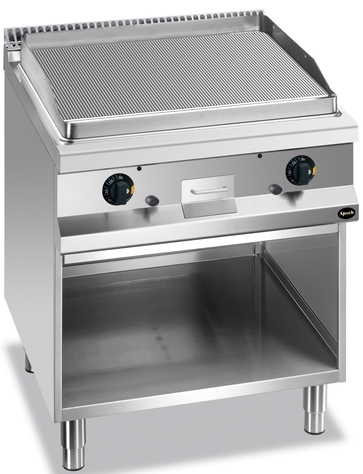 Рабочая поверхность с выделенной зоной сбора конденсата. С трёх сторон имеются бортики приподнятого типа, которые эффективно предотвратят разбрызгивание. Небольшой наклон сковороды кпереди. Решётка вытяжки размещена вдоль модуля. Зона хранения открытого типа. Емкость для сбора жира. Регулированная панель электромеханического типа. Индивидуальные дисковые регуляторы для каждой половины сковороды.