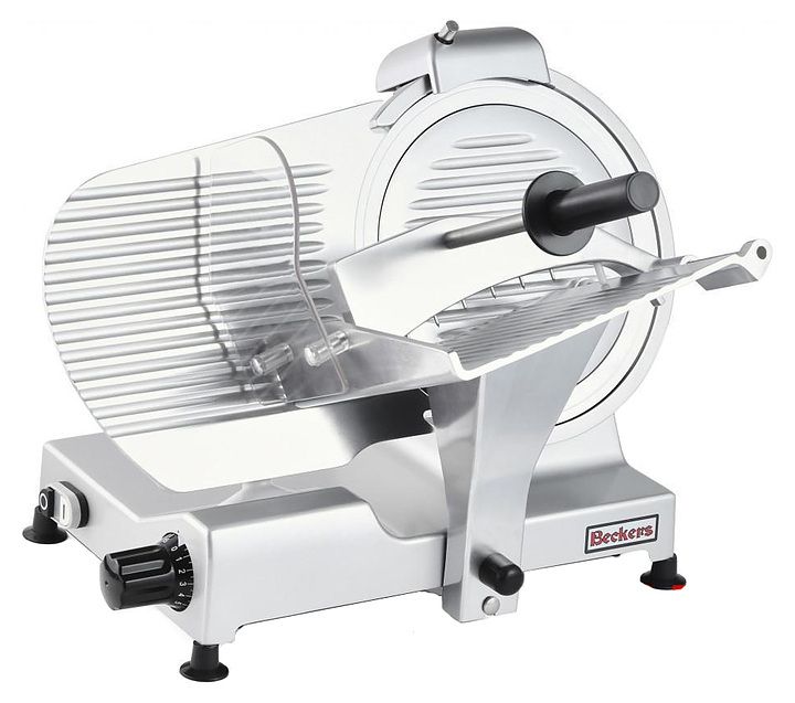 BECKERS BKL 220представляет собой полуавтоматический электрический слайсер. Оборудование предназначено для нарезки мяса, колбасных изделий, сыров и других продуктов. Оборудование позволяет нарезать продукты на ломтики одинакового размера. Оно подходит для оснащения торговых точек, пунктов общественного питания. В оборудовании встроено затачивающее устройство, что гарантирует необходимый уровень остроты ножа. В конструкции предусмотрена удлиненная рукоятка для удобного захвата оператором. В качестве материала изготовления ножа используется хромированная сталь, произведенная по технологии 3G. Корпус произведен из анодированного полированного алюминия.