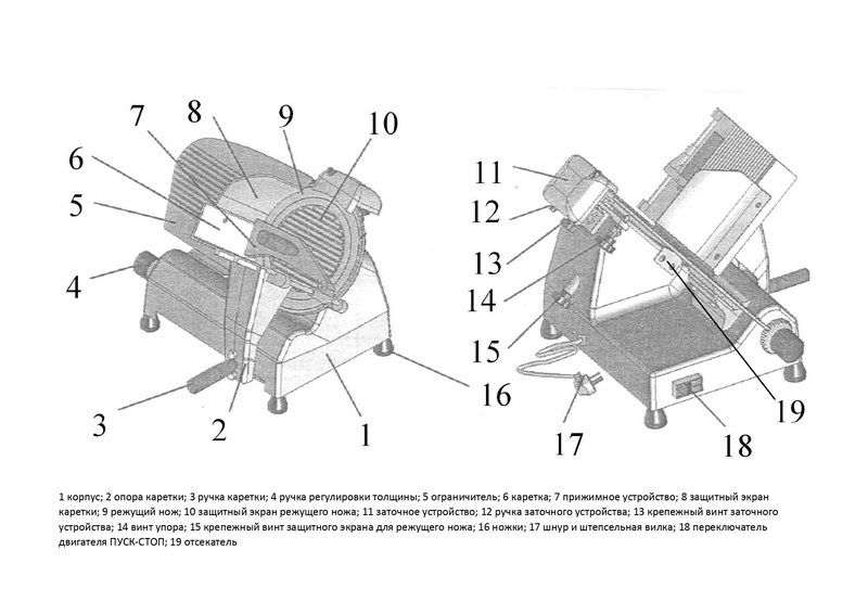 - электромеханическое управление – кнопки запуска/остановки, поворотная рукоятка корректировки толщины нарезки;