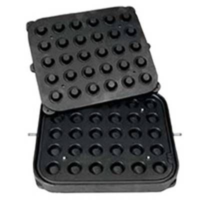Изделие состоит из двух пластин с выемками и выпуклостями. Первую крепят к неподвижной станине тарталетницы, а вторую – к подвижной верхней части. Данная модель имеет 30 круглых форм. Качественное антипригарное покрытие, созданное из теплопроводящего сплава, позволяет получать идентичные по размерам и одинаково пропеченные заготовки из теста.