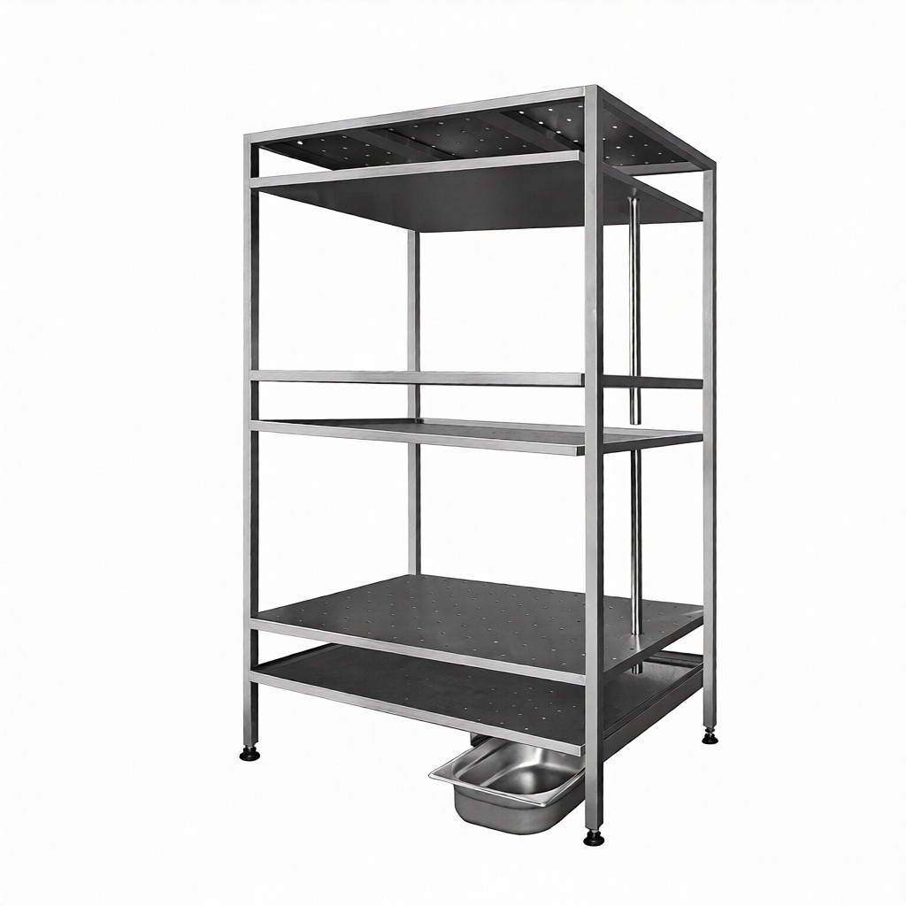3 полки перфорированные с поддоном, труба для стока жидкости. Лоток на направляющих. Все детали выполнены из высококачественной нержавеющей стали.