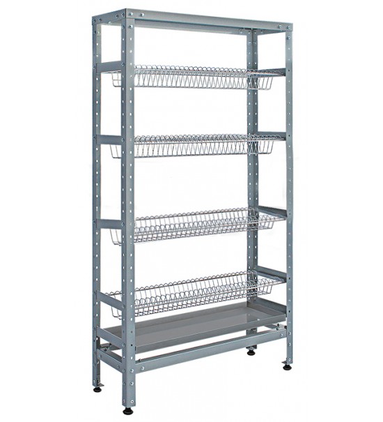 Полки выполнены из прутка с полимерно — порошковым покрытием. Каркас стеллажа разборный. Стеллажи в стандартном исполнении имеют 4 полки. Стойки выполнены из уголка из оцинкованной стали.