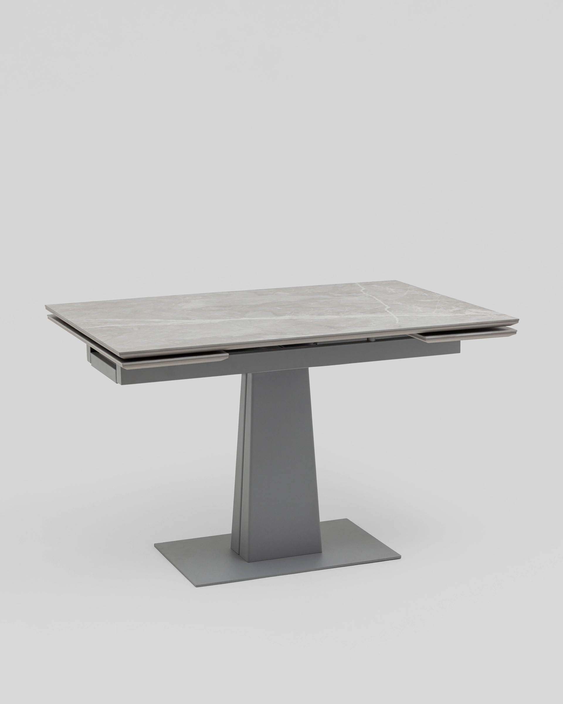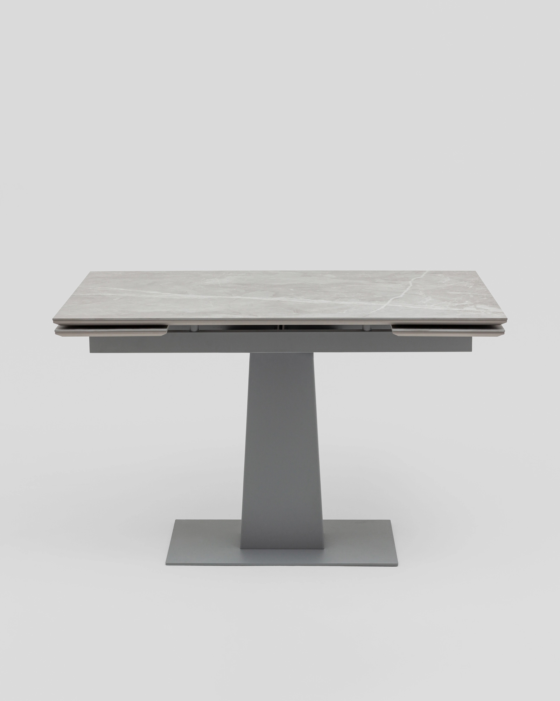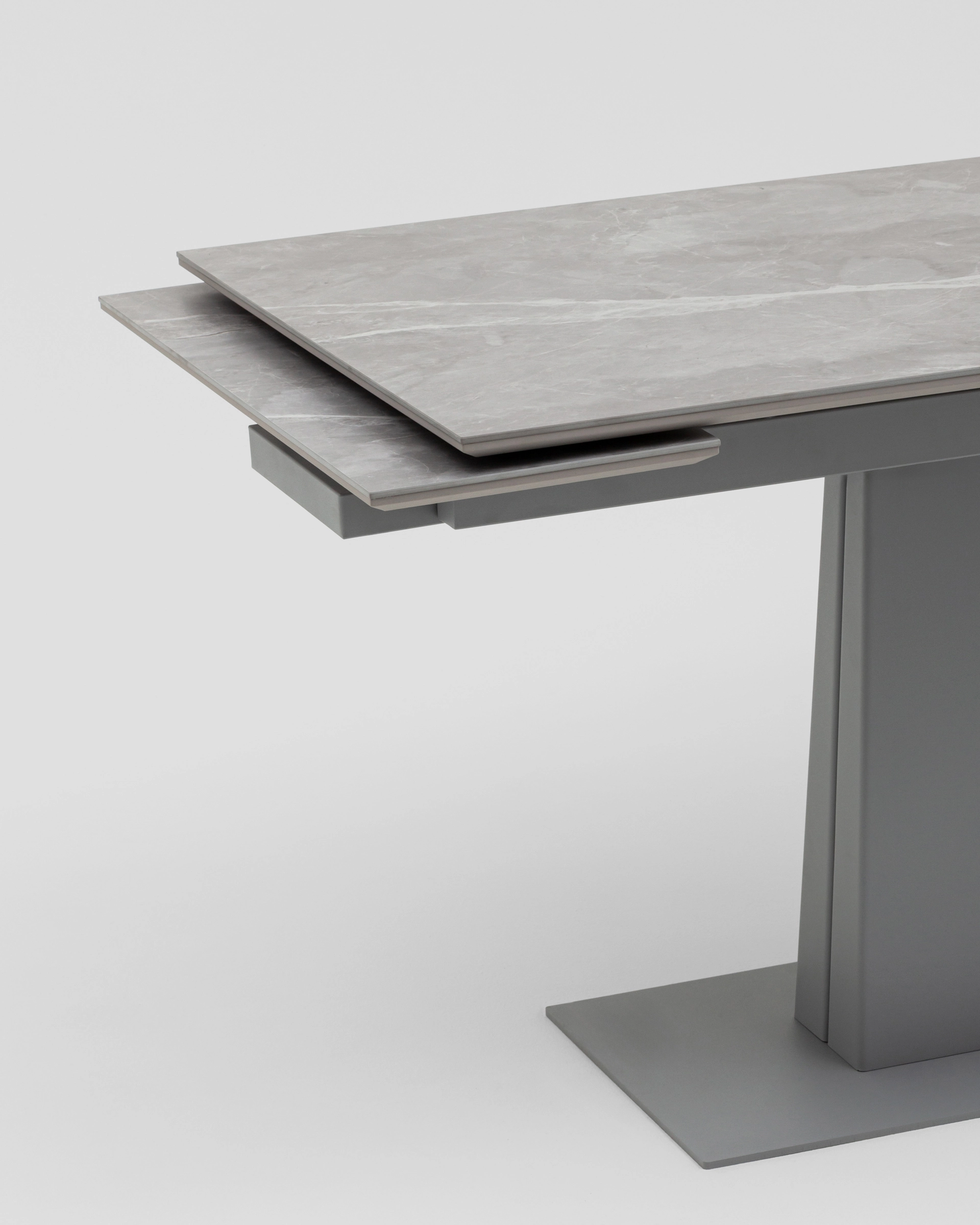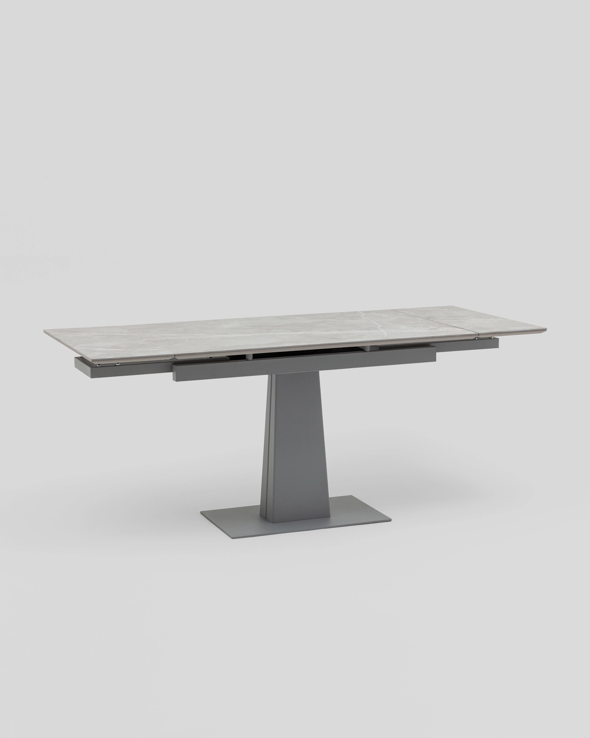 Основание из прочного металла обеспечивает максимальную устойчивость и выдерживает высокие нагрузки. Центральная ножка с трапециевидным профилем не только визуально уравновешивает конструкцию, но и обеспечивает комфорт при размещении стульев по периметру.