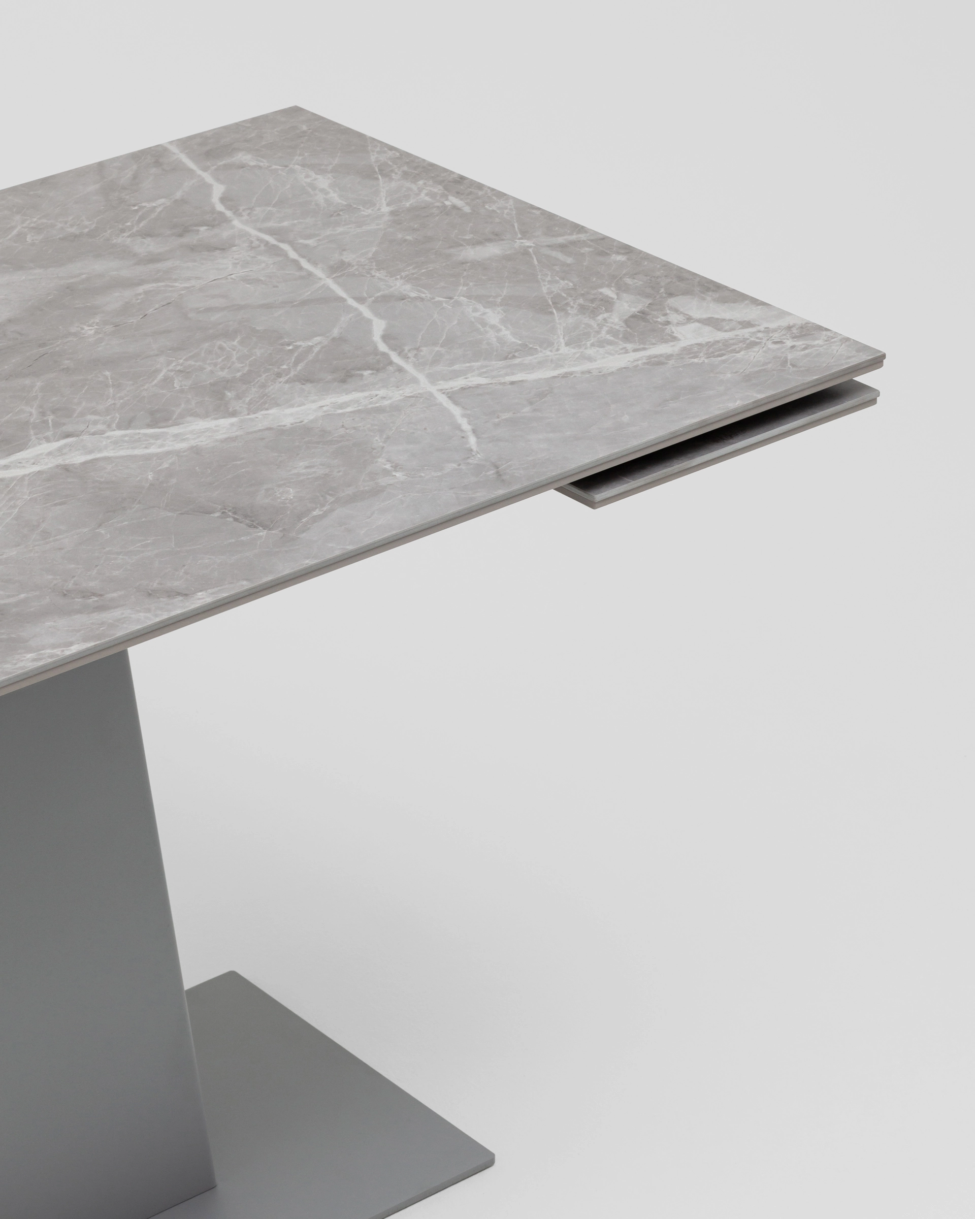 Столешница выполнена из прочной керамики с изысканным серым мраморным рисунком (оттенок Larka grey). Керамическое покрытие отличается высокой устойчивостью к влаге, перепадам температур, царапинам и механическим повреждениям. Поверхность легко очищается и сохраняет презентабельный вид на долгие годы.