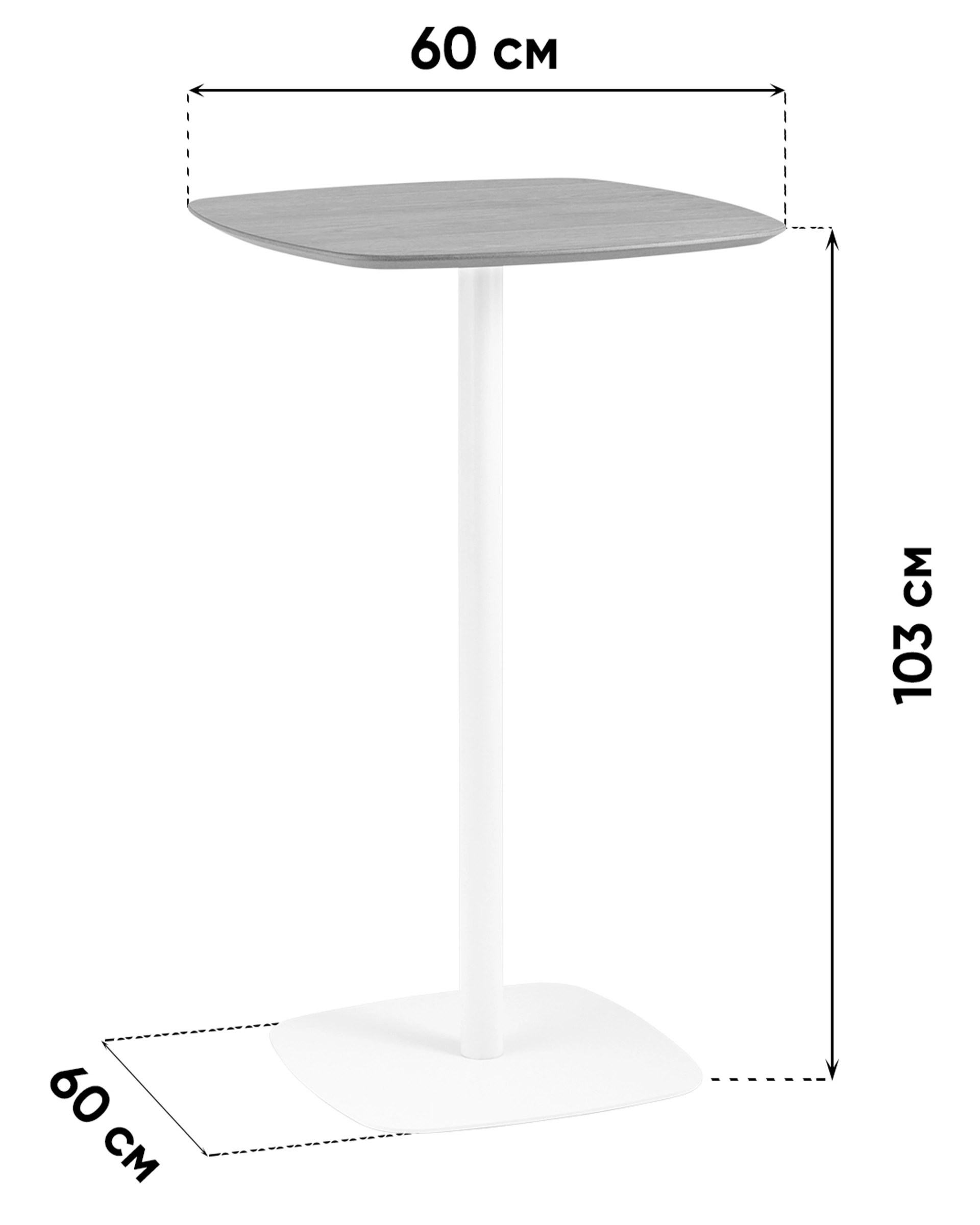 Компактная столешница 60*60 см выполнена из МДФ с покрытием из шпона в белом цвете. Устойчивое основание изготовлено из металла в тон столешнице.