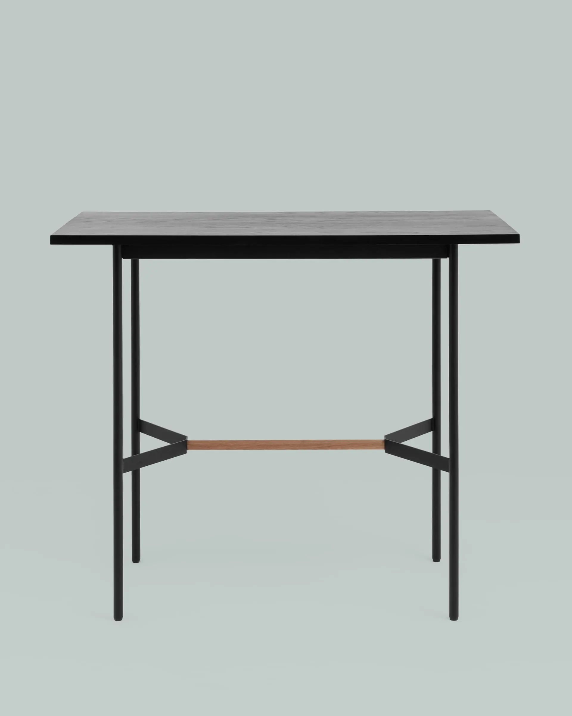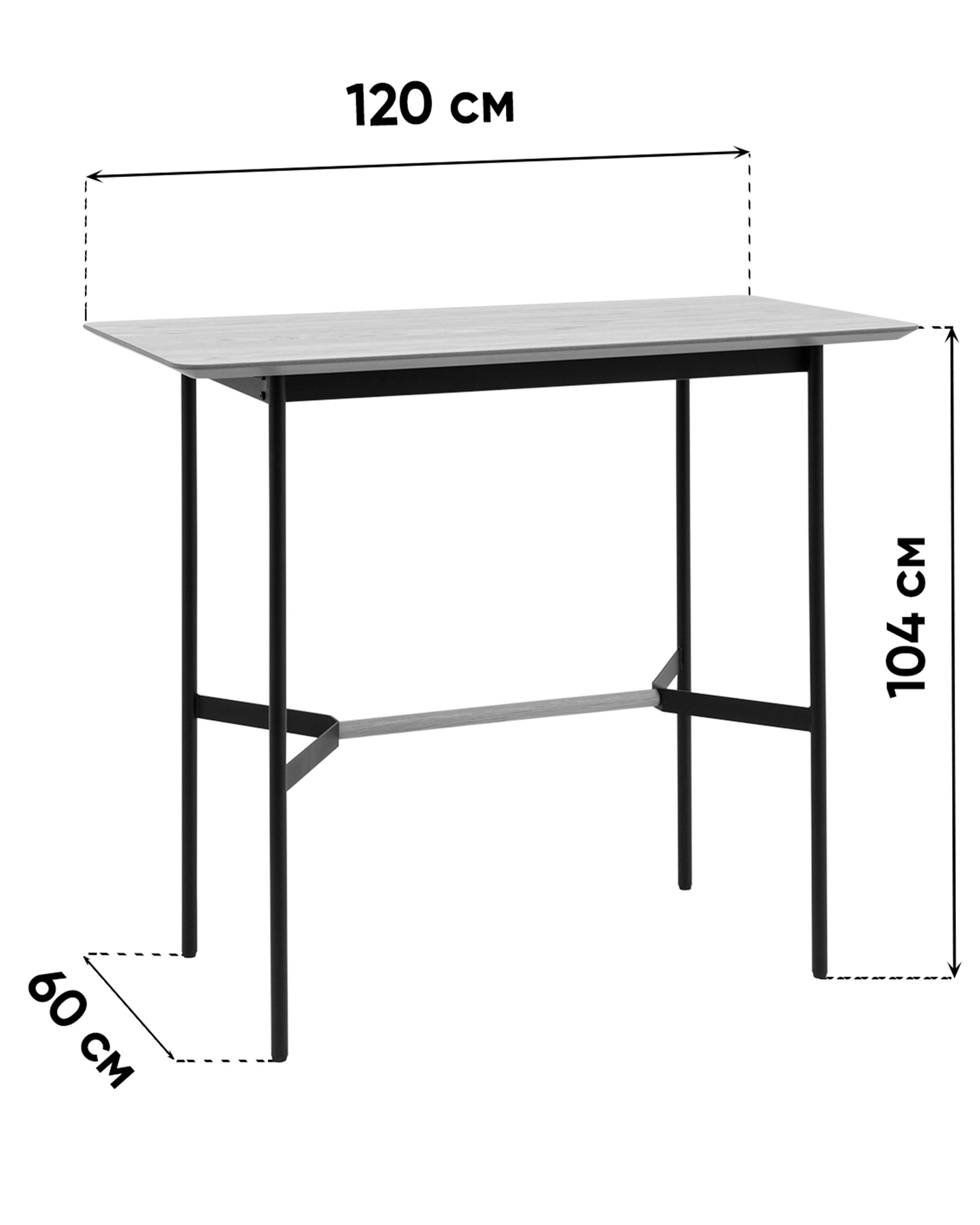 Прямоугольная столешница 120*60 см выполнена из МДФ с покрытием из краски в черном цвете. Каркас и ножки стола изготовлены из металла в тон столешнице, центральная перекладина – из массива дерева.