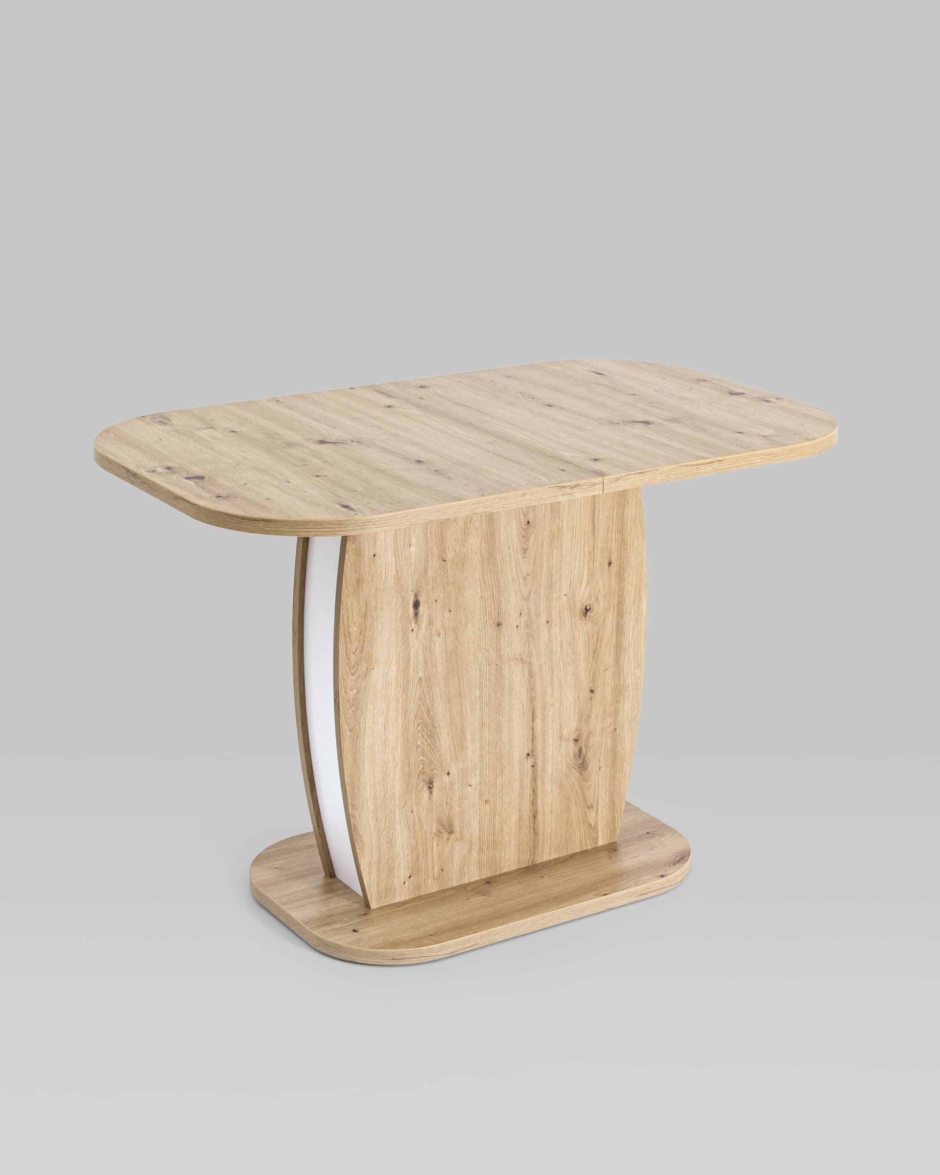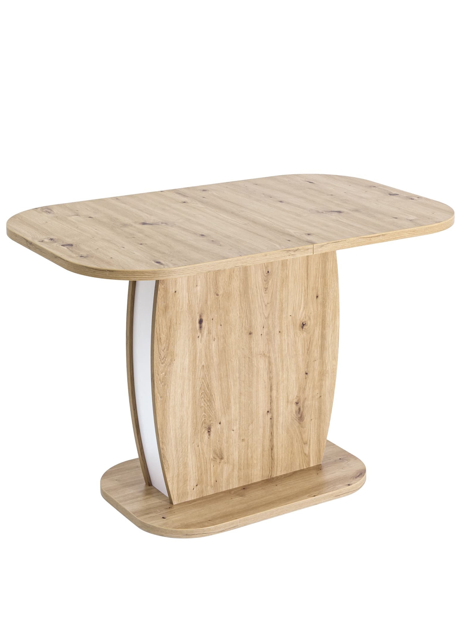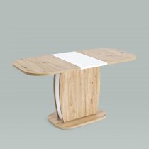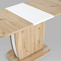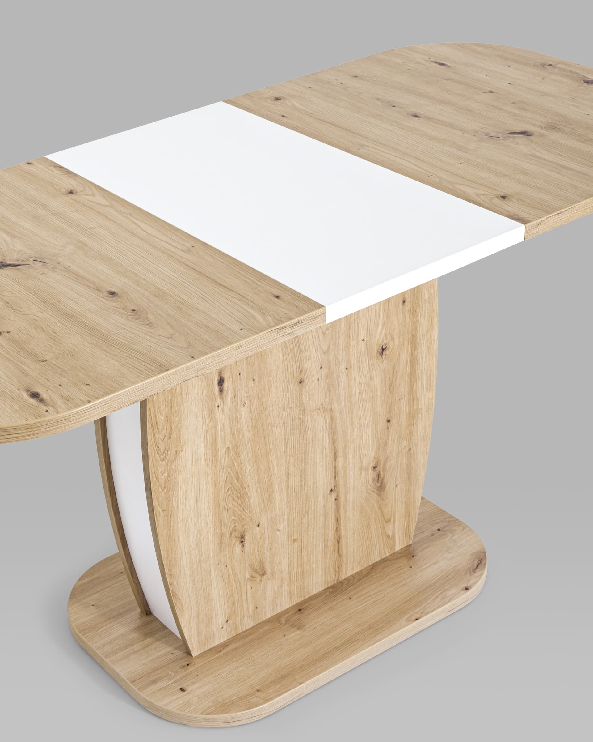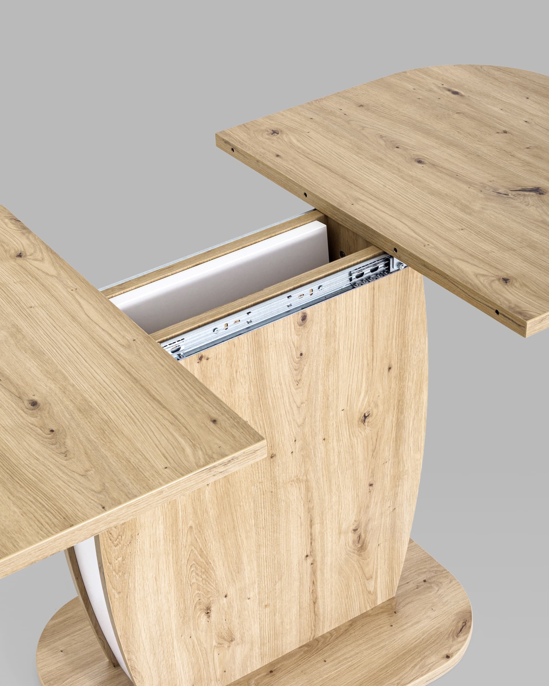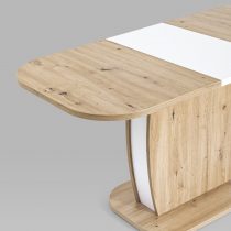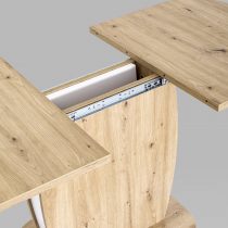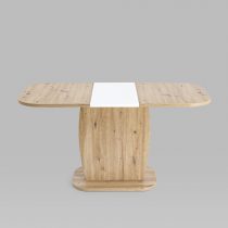 Обеденный стол цвета дуб из коллекции BARREL c синхронно-раздвижным механизмом. Разложить столешницу не составит труда даже подростку. Для того, чтобы разложить стол, достаточной потянуть за одну из половинок столешницы, вторая половинка при этом раздвинется автоматически, далее следует извлечь цельную вставку из основания стола, аккуратно уложить ее на основание, сдвинуть половинки и закрепить специальным зажимом.