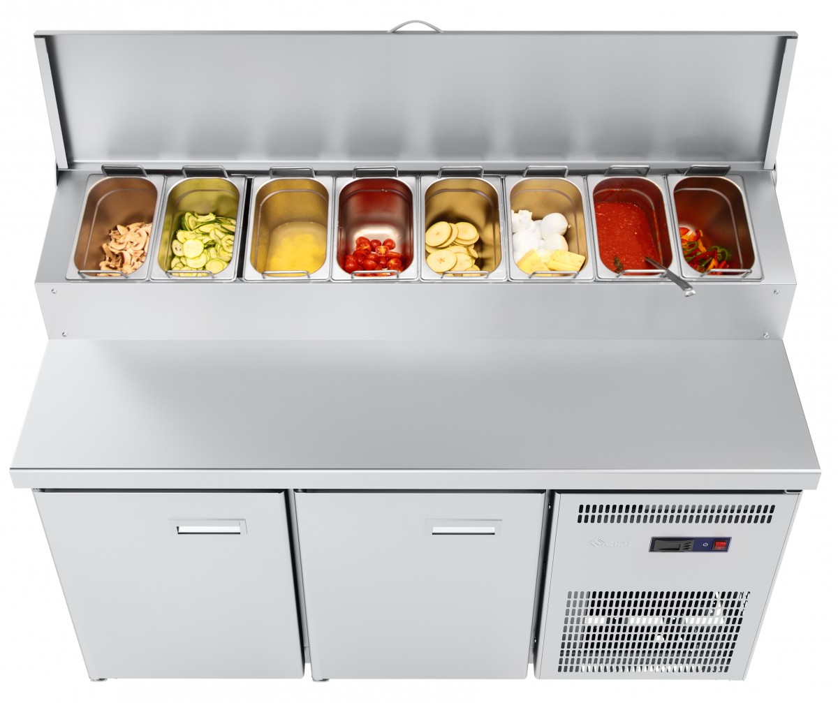 Практичное и надежное оборудование для изготовления и хранения пиццы — холодильный столСХС-70-01П. Два отсека с распашными дверками удобны для хранения ингредиентов и готовой пиццы при температуре от -2 до +8°C, а неохлаждаемую столешницу можно использовать в качестве рабочей поверхности. Кроме того имеется охлаждаемый верхний отсек (+5°С) для размещения восьми гастроемкостей GN 1/4-150 (входят в комплект). Холодильная система находится в отдельном отсеке. В основных отсеках имеются полки-решетки под GN1/1. Эксплуатировать стол для пиццы следует при t° не более +42°С окружающей среды. В вашем распоряжении — 310 литров полезного объема. При установке стола на неровной поверхности пригодятся регулируемые ножки.