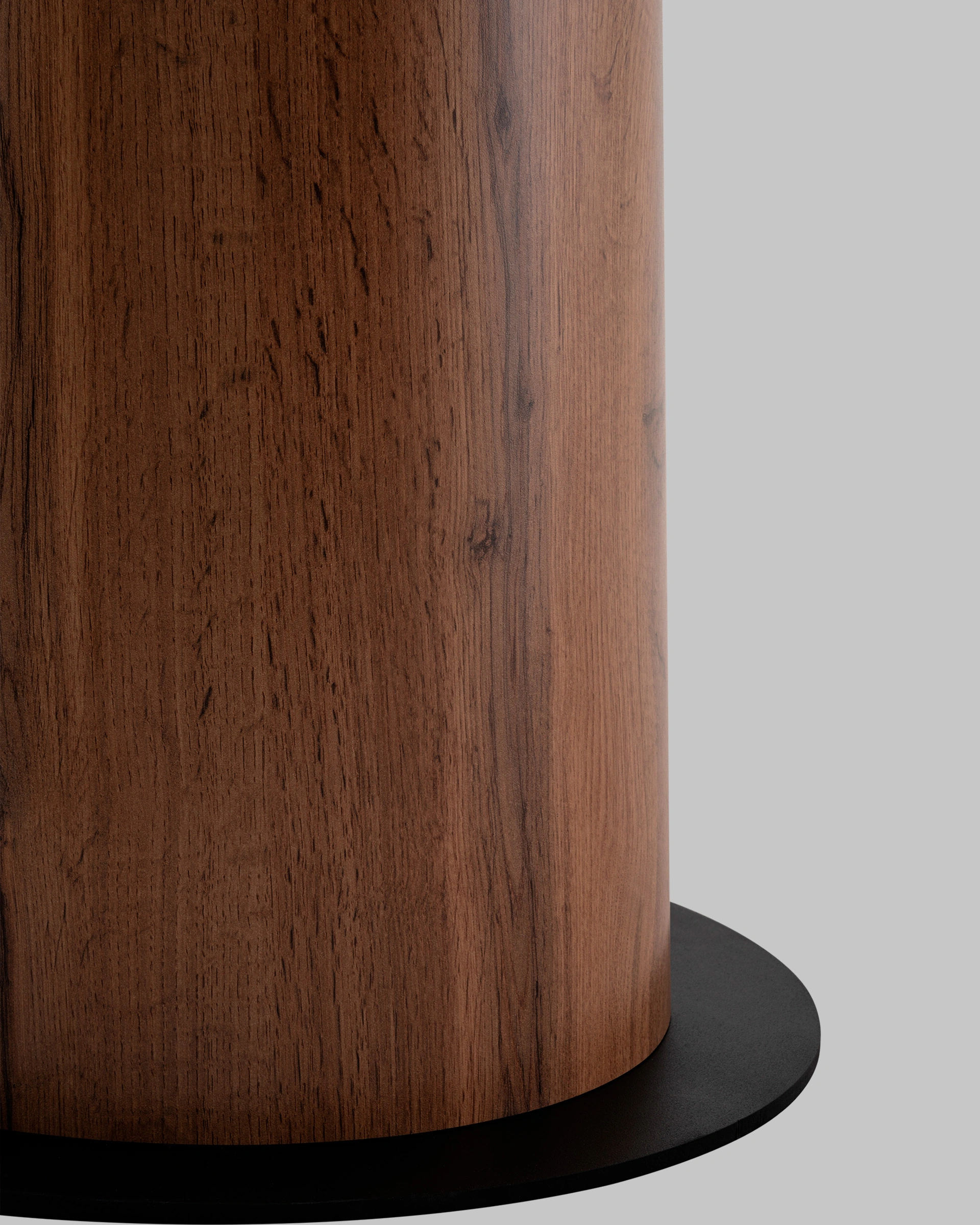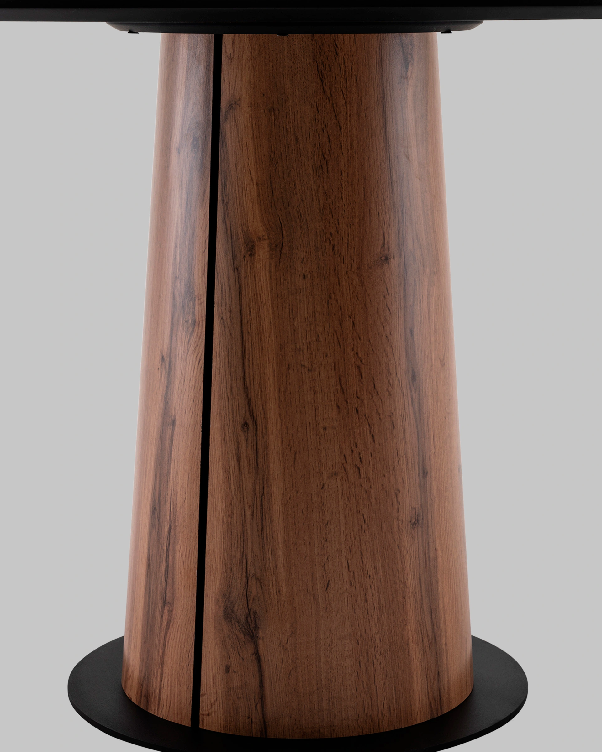 Центральная опора в виде сужающегося цилиндра выполнена из металла, фанеры и облицована тем же HPL, что и столешница, обеспечивая цельный внешний вид. Конструкция устойчива и выдерживает нагрузку до 60 кг. Металлическое основание дополнительно окрашено в чёрный цвет, что подчёркивает стильную геометрию стола и придаёт визуальную стабильность.
