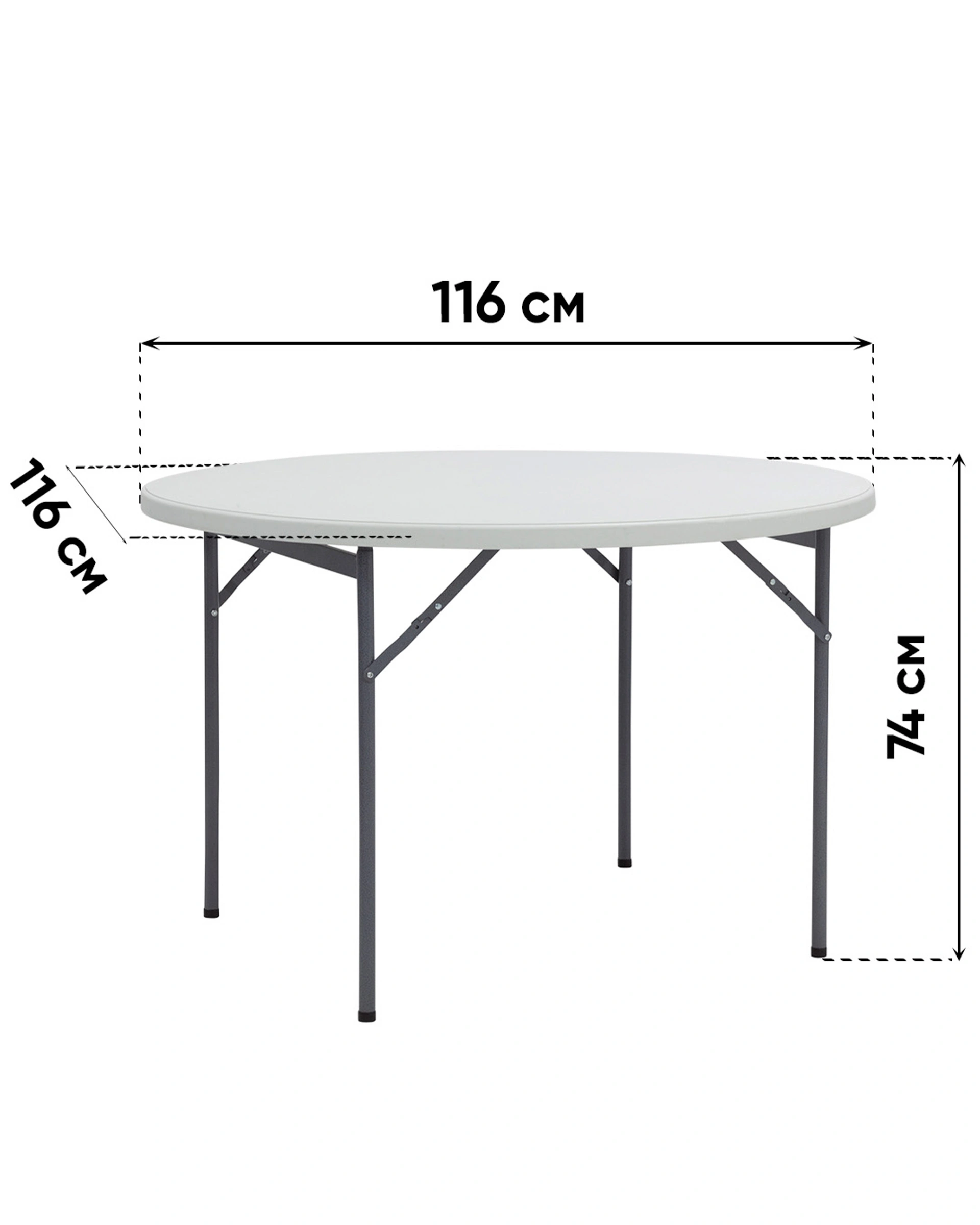 Стол круглый, 116*74 см. Для каркаса используется стальная труба особой прочности 32*1 мм, а столешница, толщиной 4 см, выполнена из 100% не переработанного полиэтилена HDPE (полиэтилен высокой плотности). Считается одним из более безопасных видов пластика. HDPE пластик выдерживает высокие нагрузки, не трескается при ударной нагрузке, эластичен в диапазоне температур от –70 до +100 °С.